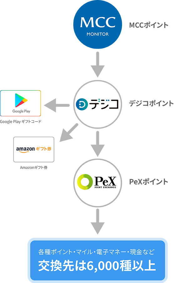 MCCポイントは1ポイントあたり1円相当のデジコポイントと交換できます。デジコポイントはAmazonギフト券、GooglePlayギフトコード、PeXポイントギフトに交換可能です。